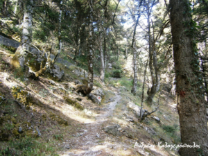 To μονοπάτι με τα κόκκινα σημάδια κατηφορίζει προς την κοίτη του ρέματος, αποκαλύπτοντας την τραχιά ομορφιά του βράχινου τοπίου. Μπροστά μας τα ερείπια ενός παλιού νερόμυλου, μας μεταφέρουν νοερά στο χρόνο.