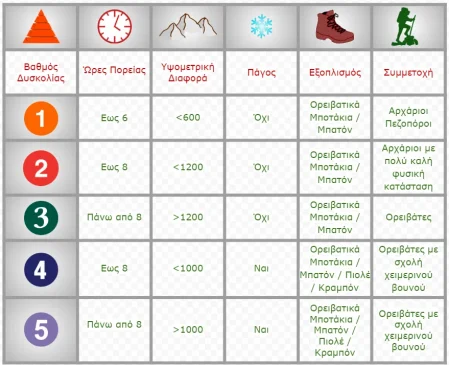 Οι πεζοπορίες μας ποικίλουν από εύκολες έως και πιο δύσκολες και έχουν βαθμούς δυσκολίας. Συμβουλευτείτε την βαθμολόγηση της διαδρομής και επικοινωνείστε μαζί μας για οποιαδήποτε απορία (πίνακας 1)